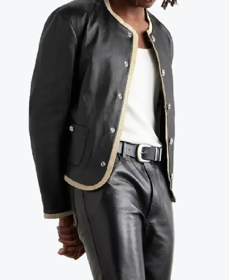 The architecture of this jacket is defined by its clean cropped silhouette and an iconic “couture-moto” aesthetic. It features a sharp rounded collarless neck accented by high-impact cream-toned textured trim that traces the entire placket, cuffs, and hemline, providing a structured and powerful frame. The front is anchored by a high-performance vertical placket featuring precision floral-shaped crystal-embellished button hardware, maintaining a precision tailored-fit profile that exudes a classic boutique vibe with a contemporary urban twist. To ensure a natural and streamlined drape at the extremities, the full-length sleeves are finished with clean rounded cuffs, while the expert boxy-cut construction and curved corners create a sophisticated architectural volume. Designed for the individual who demands maximum artistic flair within a polished frame, this Rare Jackets essential features a strategic pocket configurationāincluding two external patch waist pockets with crystal-studded accents and a hidden inner pocketāoffering secure storage while reinforcing the jacketās sleek, high-impact silhouette.