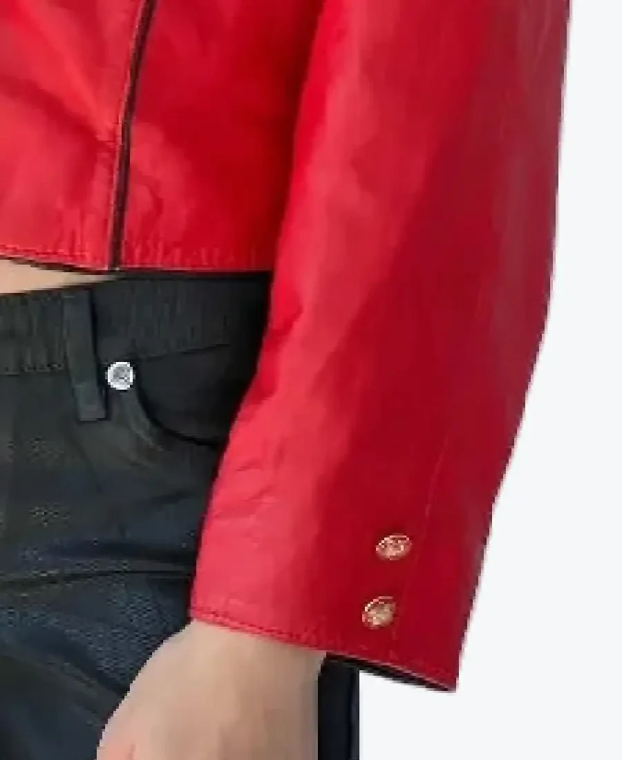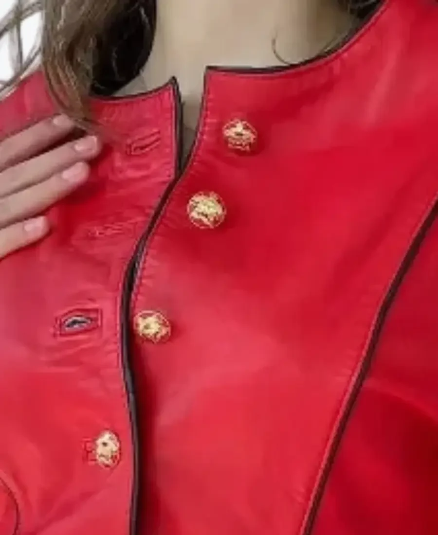 The architecture of this jacket is defined by its clean cropped waist-length silhouette and an iconic late-80s-inspired aesthetic. It features a sharp collarless neckline providing a structured and powerful frame that exudes a classic professional vibe with a dramatic avant-garde twist. The front is anchored by a high-impact vertical placket featuring precision ornate gold-tone hardware buttons, maintaining a precision tailored-fit profile accented by deep black piping along the seams for added architectural depth. To ensure a custom look at the extremities, the full-length sleeves are finished with matching gold-buttoned cuffs, while the expert vertical paneling and reinforced hemline create a sophisticated architectural silhouette. Designed for the individual who demands maximum artistic flair within a polished frame, this Rare Jackets essential emphasizes a sleek, streamlined profile for a high-impact visual statement.
