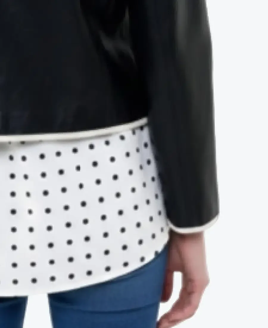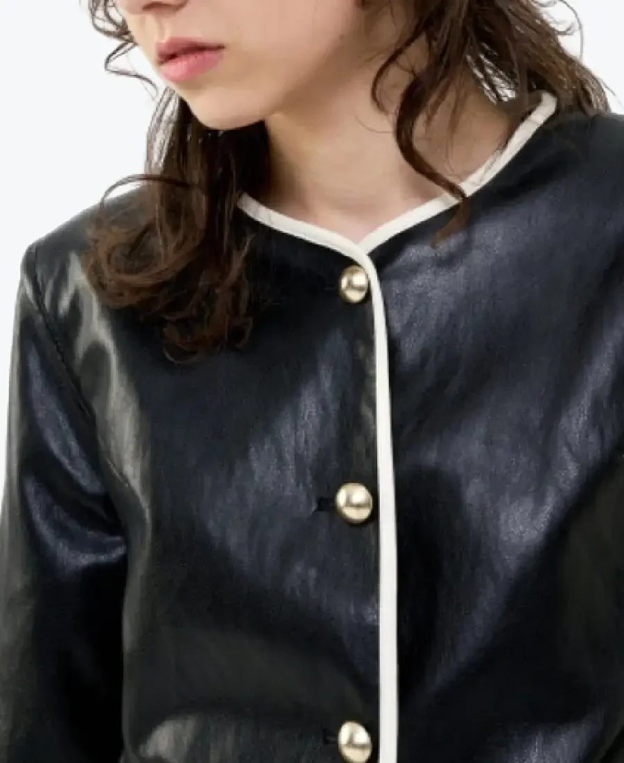 The architecture of this jacket is defined by its clean cropped silhouette and an iconic “lady-like-moto” aesthetic. It features a sharp round-neck collarless design accented by a high-impact white contrast piping that traces the entire placket and hemline, providing a structured and powerful frame that exudes a classic professional vibe with a contemporary urban twist. The front is anchored by a high-performance vertical placket featuring precision gold-tone embossed button hardware, maintaining a precision tailored-fit profile. To ensure a natural and streamlined drape at the extremities, the full-length sleeves are finished with clean open hem cuffs, while the expert structured-shoulder construction and curved-corner hemline create a sophisticated architectural volume. Designed for the individual who demands maximum artistic flair within a polished frame, this Rare Jackets essential features a strategic pocket configuration—including two discreet external welt waist pockets and a hidden inner pocket—offering secure storage while reinforcing the jacket’s sleek, high-impact silhouette.