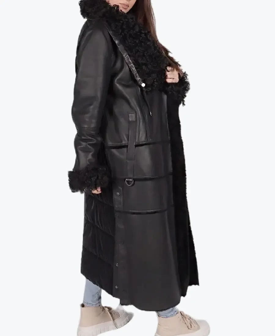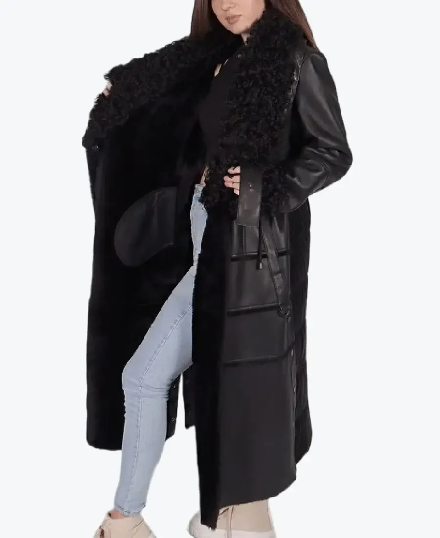 The architecture of this coat is defined by its dramatic floor-length lines and iconic textured fur trim. It features an oversized lapel style fur collar in a matching deep black, providing a voluminous and powerful frame to the neckline that exudes a classic high-fashion-meets-regal aesthetic. The high-impact design is characterized by horizontal leather banding throughout the frame, creating a striking geometric visual depth. The front is anchored by a sophisticated snap buttoned closure and a strategic integrated waist belt with a polished buckle for an architectural cinch. To ensure maximum style impact and a cozy feel at the extremities, the full-length sleeves are finished with thick faux fur-trimmed cuffs, complemented by a full-length fur-trimmed front placket. Designed for the individual who demands maximum presence within a polished frame, this Rare Jackets essential features a strategic two vertical side welt pocket configuration, offering secure storage while reinforcing the coat’s sleek, high-impact silhouette.