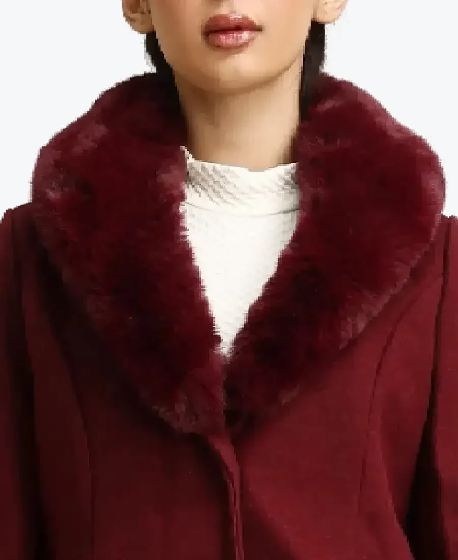 Women’s Burgundy Faux Fur Collar Wool Coat