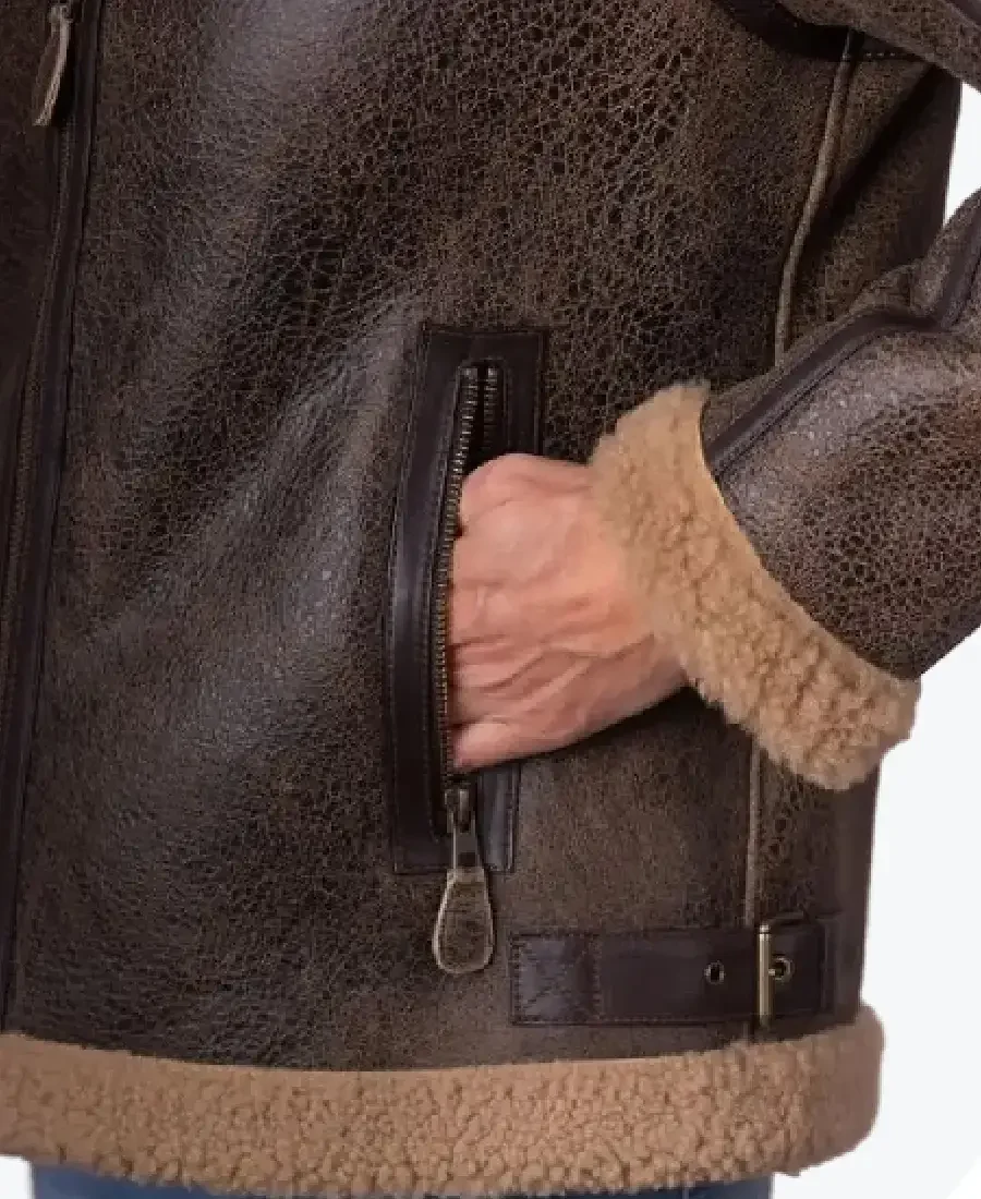 The architecture of this jacket is defined by its clean waist-length lines and an iconic B-3 inspired aviator aesthetic. It features a bold oversized shearling collar providing a textured and powerful frame to the neckline that can be secured with integrated leather buckle straps for maximum protection against arctic gusts. The front is anchored by a high-performance heavy-duty zipper closure maintaining a precision tailored fit profile that allows for effortless layering over seasonal knits. To ensure maximum heat retention and a custom fit at the extremities the full-length sleeves and hemline are finished with thick exposed cream shearling cuffs complemented by sophisticated dark leather piping and horizontal paneling throughout the frame. Designed for the individual who demands maximum organized utility within a polished frame this Rare Jackets essential features a strategic pocket configuration including two vertical side-entry zipper pockets offering secure storage while reinforcing the jacket’s sleek high-impact silhouette.