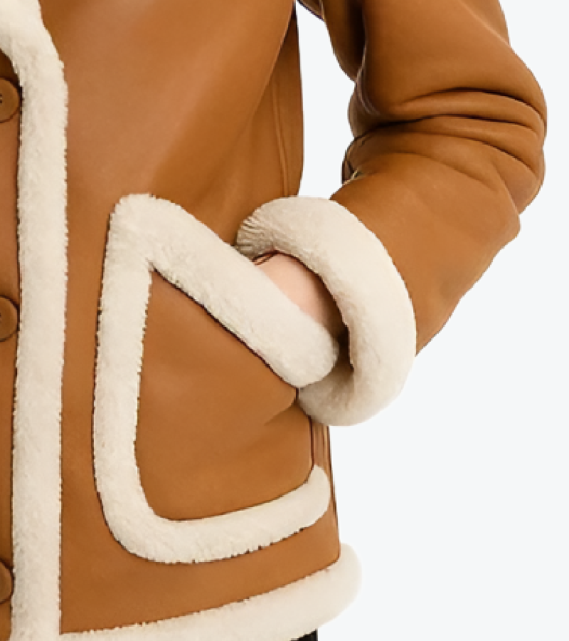This jacket stands out with its functional and stylish details, including a smooth front zipped closure that ensures a secure and windproof fit. The design is further enhanced by shearling-trimmed cuffs that help trap heat at the wrists while providing a beautiful visual contrast against the leather sleeves. Two spacious side pockets offer a convenient place to warm your hands or store your daily essentials. Whether you are layering it over a simple knit or pairing it with tailored trousers, this lambskin leather jacket ensures you stay cozy while maintaining a sharp, modern appearance.