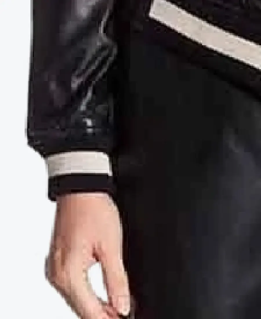 The architecture of this jacket is defined by its clean waist-length silhouette and an iconic “chic-sport” aesthetic. It features a sharp rib-knitted collar accented with a high-impact white stripe, providing a structured and powerful frame to the neckline. The front is anchored by a high-performance silver-tone zipper closure, maintaining a precision tailored-fit profile that allows for effortless styling over monochromatic black separates. To ensure superior heat retention and a custom look at the extremities, the full-length sleeves and the unique pointed hemline are finished with matching striped rib-knitted cuffs and waistband, while the expert vertical paneling creates a sophisticated architectural volume. Designed for the individual who demands maximum organized utility within a polished frame, this Rare Jackets essential features a strategic pocket configuration—including two external slanted zipper waist pockets—offering secure storage while reinforcing the jacket’s sleek, high-impact silhouette.