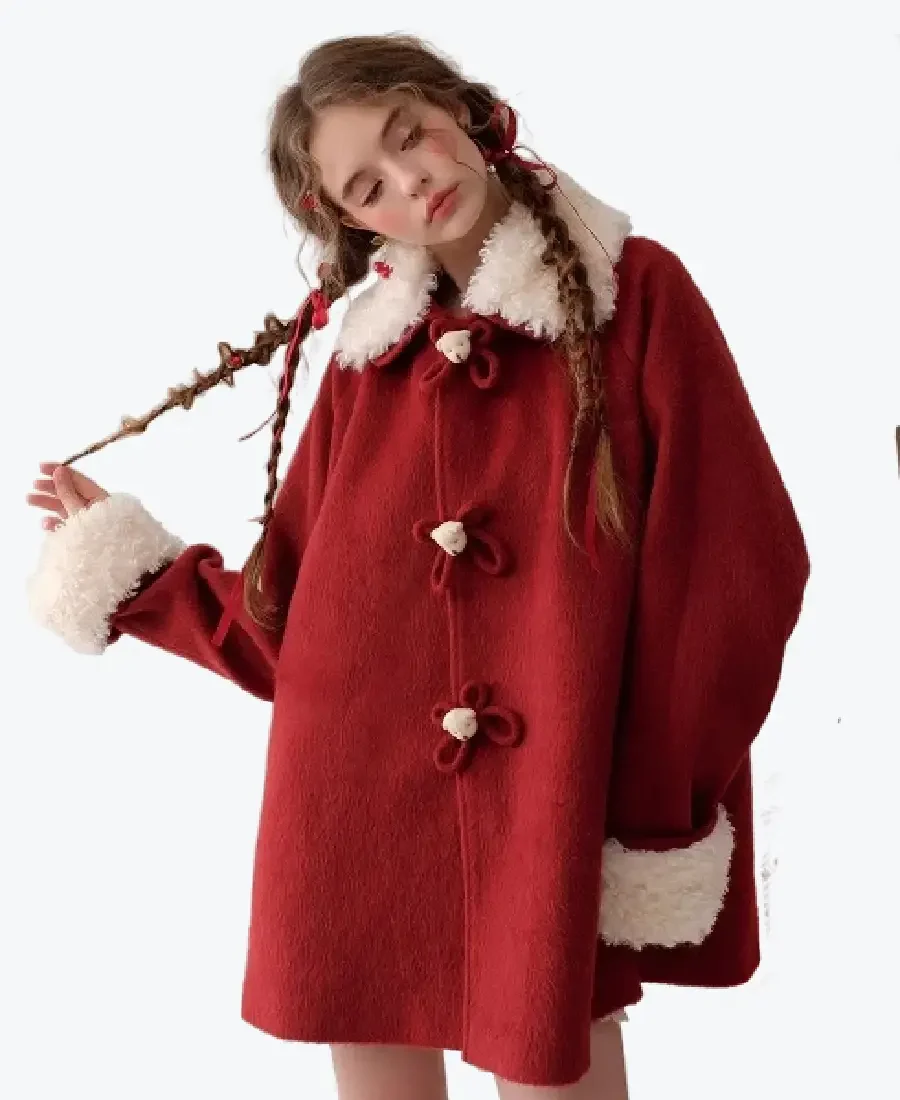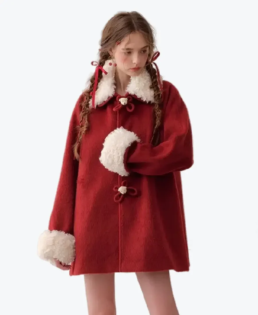 The architecture of this coat is defined by its clean thigh-length A-line silhouette and a charming “Red Riding Hood” inspired aesthetic. It features a bold oversized white faux fur collar, providing a textured and powerful frame to the neckline that offers superior soft-touch protection and a striking visual contrast. The front is anchored by a unique precision closure featuring three high-impact toggle-style buttons detailed with plush accents and bow-shaped fabric loops, maintaining a precision tailored profile with a playful architectural twist. To ensure maximum heat retention and a custom look at the extremities, the full-length sleeves are finished with thick exposed white fur cuffs, creating a cohesive and luxurious color-blocked look. Designed for the individual who demands maximum organized utility within a polished frame, this Rare Jackets essential reinforces a sleek, high-impact silhouette perfect for making a statement in the snow.