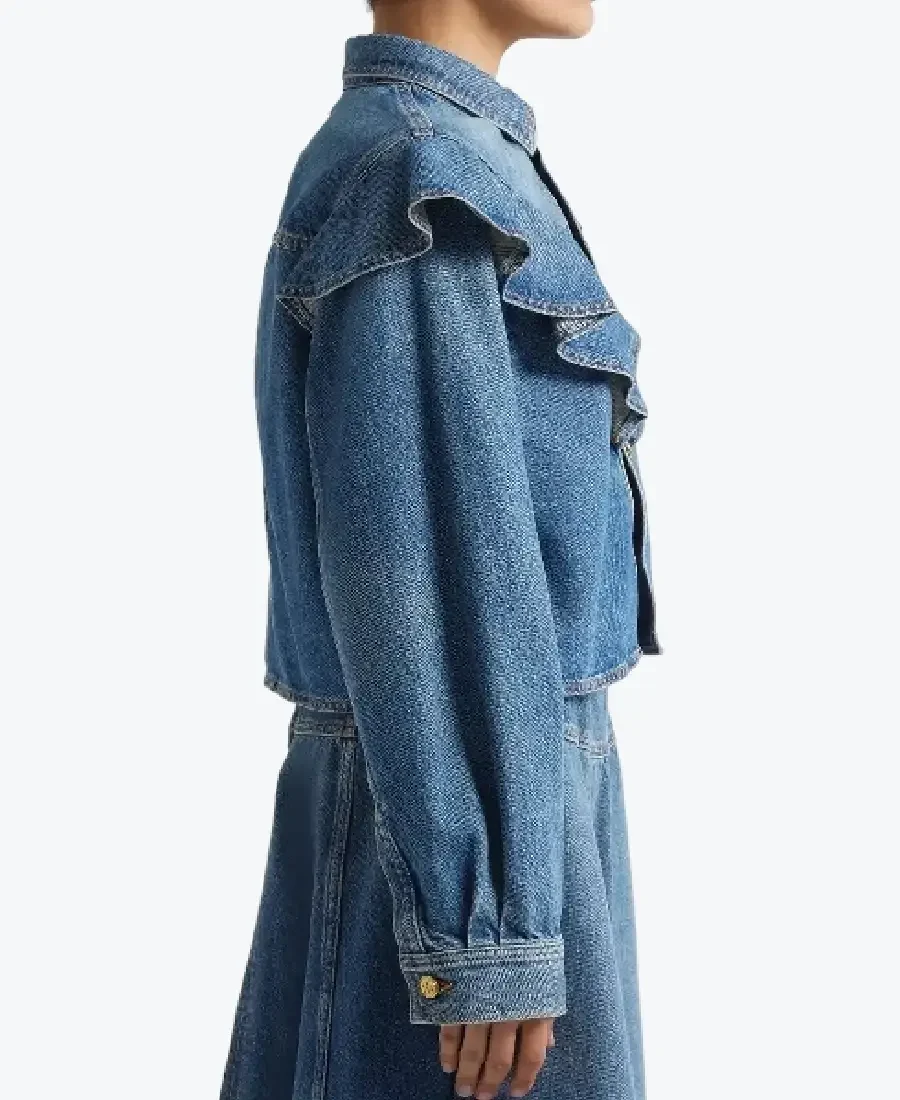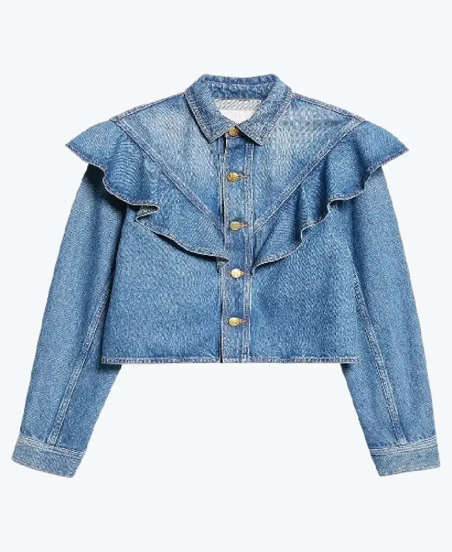 The architecture of this jacket is defined by its dramatic cropped silhouette and an iconic ruffled Victorian-meets-modern-western aesthetic. It features a sharp shirt-style denim collar providing a structured and powerful frame to the neckline. The front is anchored by a high-impact vertical placket featuring five precision gold-tone hardware buttons, maintaining a precision tailored fit profile. The defining feature is the voluminous V-shaped ruffle overlay across the chest and shoulders, which creates a sophisticated architectural movement and a high-definition silhouette. To ensure a natural and streamlined drape at the extremities, the full-length sleeves are finished with clean button cuffs, while the expert paneling throughout the torso reinforces the jacket’s sleek, high-impact aesthetic. Designed for the individual who demands maximum artistic flair within a polished frame, this Rare Jackets essential is the ultimate statement piece for a high-fashion denim-on-denim look.