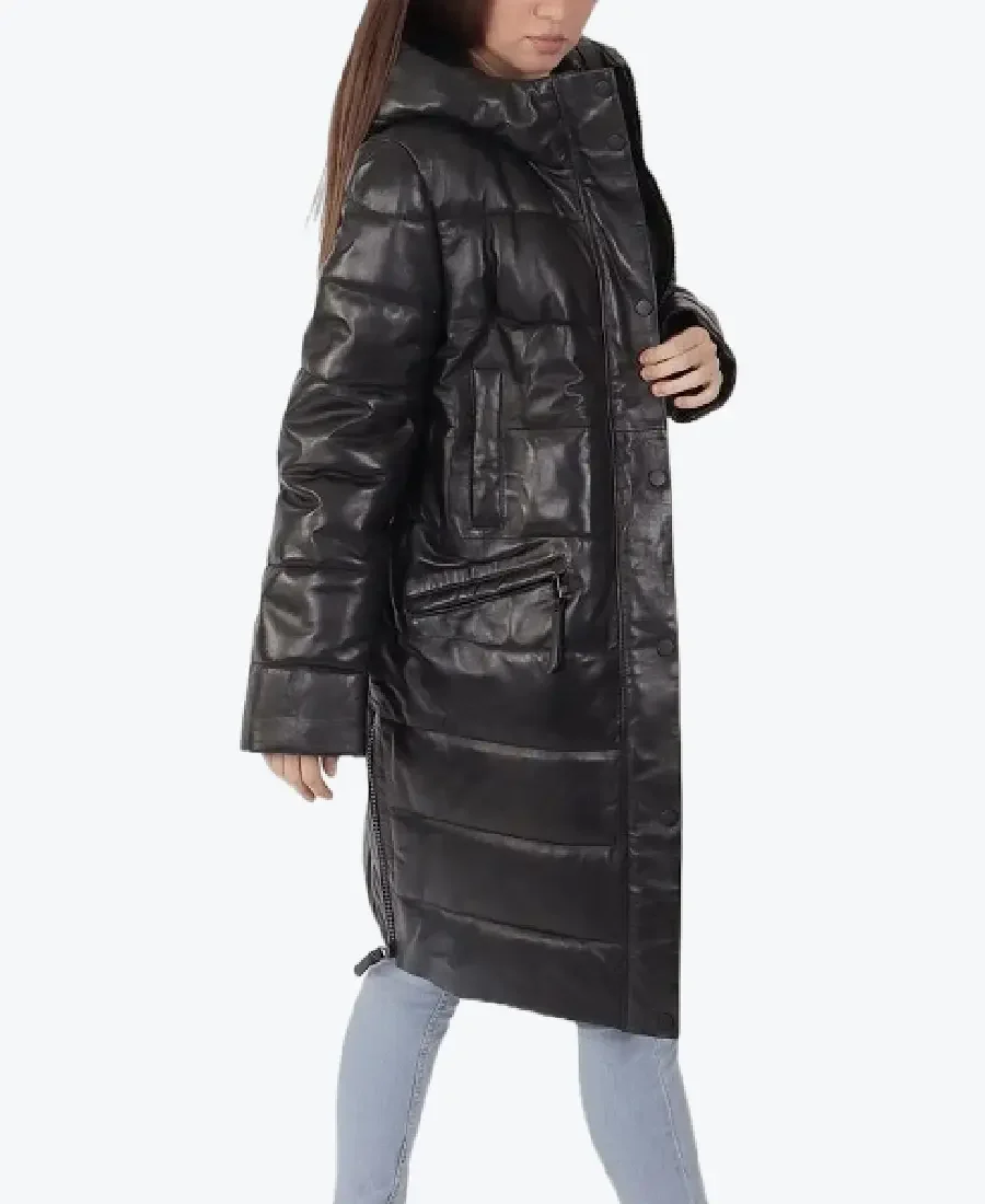 The architecture of this jacket is defined by its clean, elongated lines and iconic quilted puffer aesthetic. It features a high-performance hooded collar, providing a textured and powerful frame to the neckline that offers superior protection against arctic gusts. The front is anchored by a sophisticated snap-tab button placket over a heavy-duty zipper closure, maintaining a precision long-line slim-fit profile that accentuates the silhouette while ensuring maximum heat retention. To ensure a streamlined look at the wrists, the full-length sleeves are designed with a tapered finish, complemented by wide horizontal quilting that adds structural depth to the mid-length frame. Designed for the individual who demands maximum organized utility within a standout frame, this Rare Jackets essential features a strategic five-pocket configuration, including four oversized outer pockets (including diagonal zip details) and a hidden inner pocket, offering secure storage while reinforcing the jacket’s powerful, high-impact silhouette.