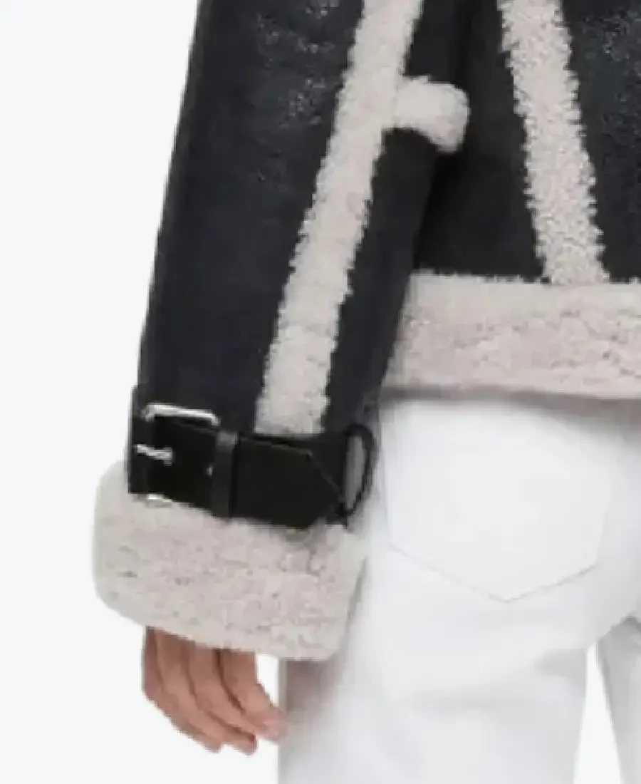 The architecture of this jacket is defined by its clean, oversized lines and iconic cross-body fur trim. It features a bold, oversized fur-lined lapel collar, providing a textured and powerful frame to the neckline that exudes a classic aviator-meets-high-fashion aesthetic. The high-impact design is characterized by horizontal fur banding across the waist and along the front placket, creating a striking geometric visual frame. The front is anchored by a high-performance asymmetrical zipper closure, maintaining a precision cropped relaxed-fit profile. To ensure maximum heat retention and a custom cinch at the extremities, the full-length sleeves are finished with thick fur-trimmed cuffs and sophisticated integrated leather buckle straps. Designed for the individual who demands standout utility within a legendary frame, this Rare Jackets essential reinforces the jacket’s powerful, high-impact silhouette.