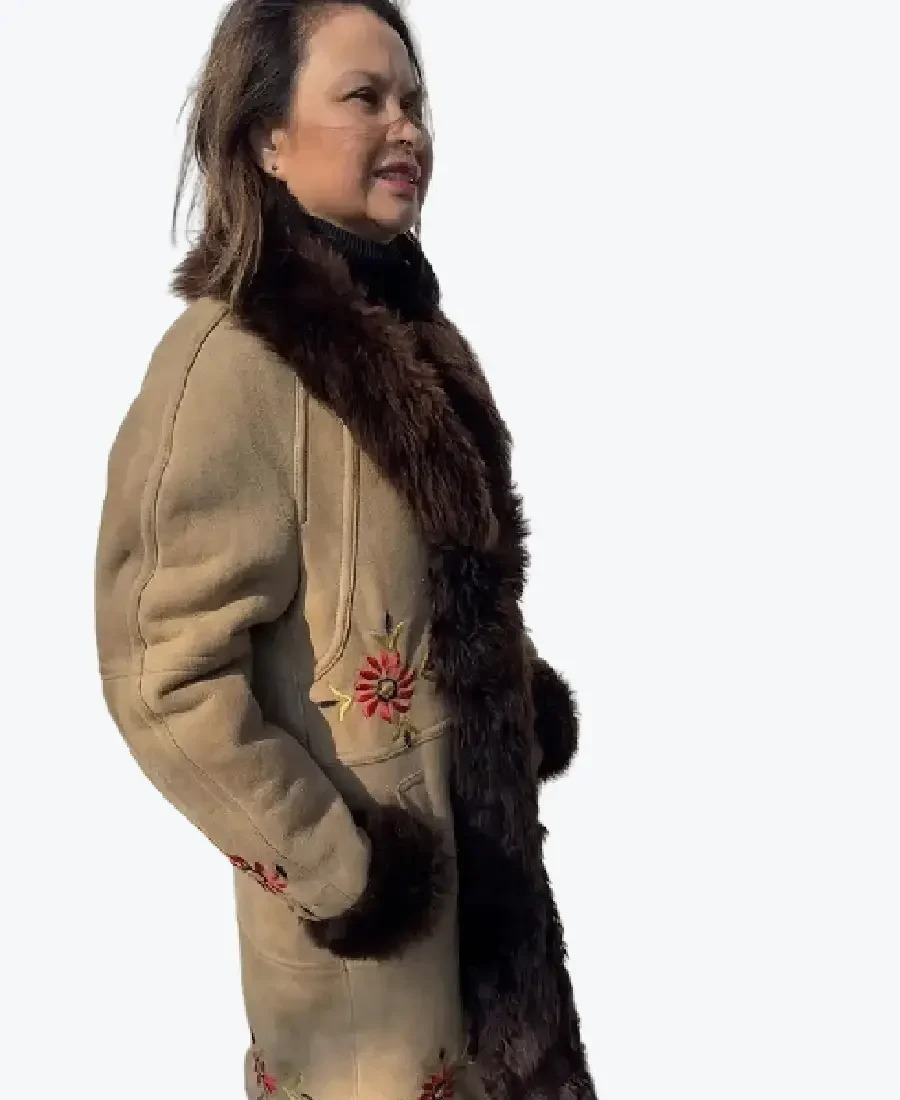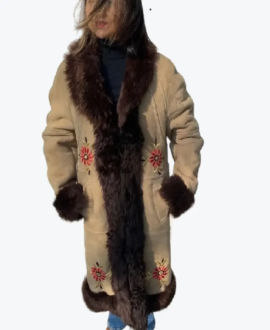 The architecture of this coat is defined by its clean knee-length longline silhouette and an iconic 1970s-inspired Afghan aesthetic. It features a bold oversized faux fur collar and matching vertical fur trim, providing a textured and powerful frame to the neckline and front that offers superior soft-touch protection. The front is anchored by a high-performance concealed zipper closure, maintaining a precision tailored profile while allowing the intricate floral embroidery—meticulously detailed in vibrant red and gold threads—to take center stage on the torso and hemline. To ensure maximum heat retention and a custom look at the extremities, the full-length sleeves and hemline are finished with thick exposed dark brown fur cuffs and trim, creating a sophisticated color-blocked contrast. Designed for the individual who demands maximum organized utility within a polished frame, this Rare Jackets essential features a strategic pocket configuration including two deep side-entry pockets for secure storage while reinforcing the coat’s sleek, high-impact silhouette.