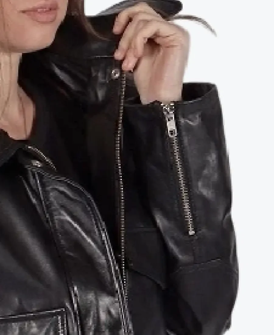 The architecture of this jacket is defined by its clean cropped waist-length silhouette and an iconic utilitarian-chic aesthetic. It features a sharp shirt-style leather collar providing a structured and powerful frame to the neckline that exudes a classic professional vibe with a dramatic urban twist. The front is anchored by a high-performance silver-tone dual closure system—featuring both a precision zipper and high-impact snap-tab hardware—maintaining a precision tailored-fit profile that allows for effortless layering over black crop tops and high-waisted light-wash denim. To ensure a custom look and a streamlined drape at the extremities, the full-length sleeves are finished with clean zipper cuffs, while the expert vertical paneling and reinforced hemline create a sophisticated architectural volume. Designed for the individual who demands maximum organized utility within a polished frame, this Rare Jackets essential features a strategic pocket configuration including two oversized external flap waist pockets offering secure storage while reinforcing the jacket’s sleek, high-impact silhouette.