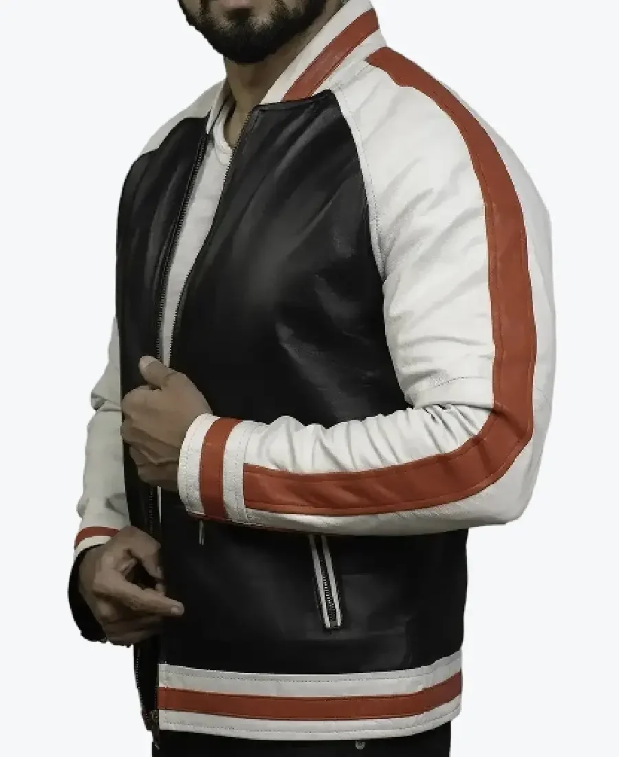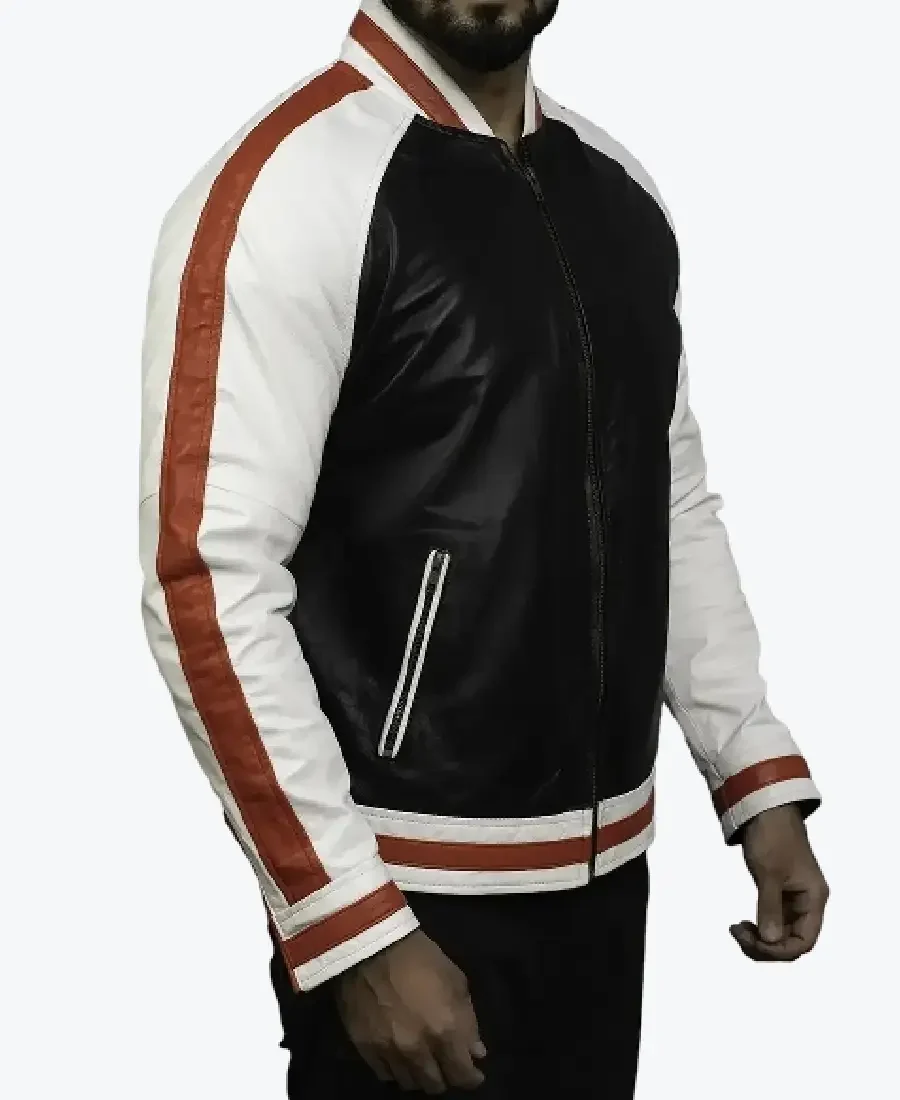 The Zack Classic Red Stripped Bomber Style Jacket by Rare Jackets is a masterclass in high-contrast urban architecture and precision luxury meticulously handcrafted from premium cowhide leather or high-grade faux leather. Drenched in a commanding obsidian black core paired with clinical arctic white sleeves and striking crimson racing stripes, this piece leverages a robust high-grade grain and natural wind-resistant properties to provide a formidable protective shell for the modern landscape. The leather is selected for its industrial-grade durability and a sophisticated semi-gloss buttery finish, ensuring the jacket maintains a sharp authoritative frame while projecting a raw, high-fashion energy. Inside, the garment is fully integrated with a silky viscose lining, providing a breathable and friction-free experience for maximum all-day comfort.